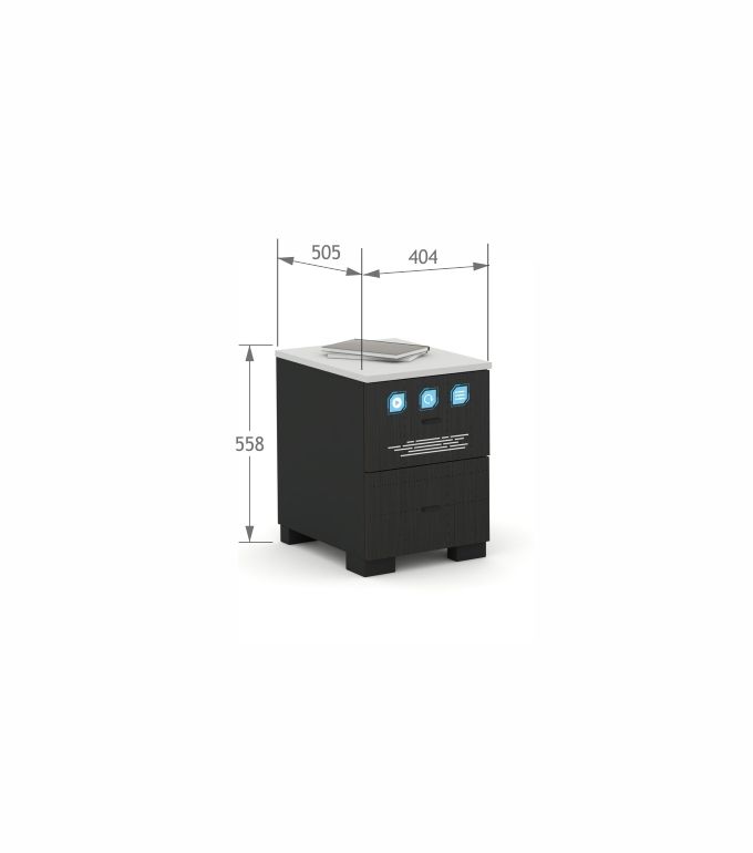 Ciemne czoła szuflad podkreślone kolorowymi aplikacjami. Korpus z antracytowej, laminowanej płyty.