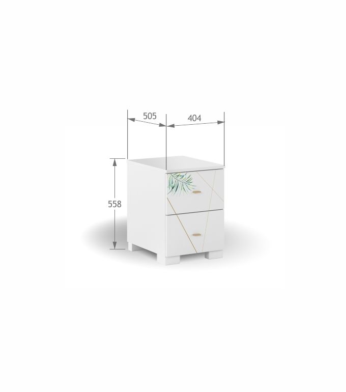 Białe czoła szuflad ozdobione liśćmi, podkreślone wyrazistymi złotymi liniami oraz uchwytami.