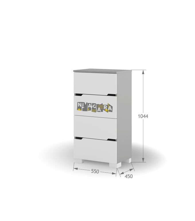 Grawerowane, malowane fronty z podróżniczym motywem. Korpus z szarej, laminowanej płyty.