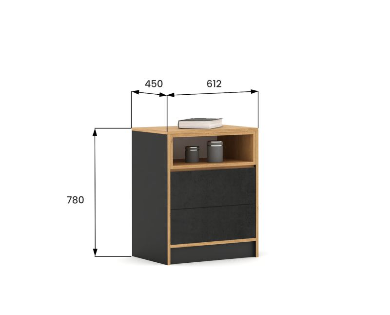 Niska komoda, to idealne rozwiązanie do zagospodarowania miejsca pod skosem lub jako dodatkowa szafka przy biurku. Fronty malowane farbami rekomendowanymi przez Polskie Towarzystwo Alergologiczne (PTA) i utwardzane światłem UV. Korpus o strukturze drewna dębowego i nadrukowany na frontach charakterystyczny wzór ciemnego betonu, to motyw przewodni kolekcji.