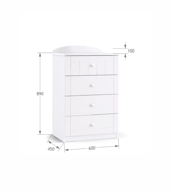 Grawerowane i malowane farbami wodnymi fronty. Delikatne, białe, półokrągłe uchwyty. Korpus z białej laminowanej płyty. Ozdobna korona.