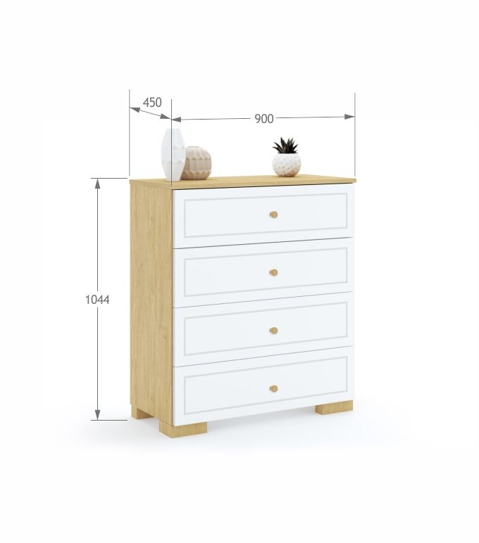 Młodzieżowa komoda szeroka z białymi, grawerowanymi frontami. Korpus i blat z dębowej, laminowanej płyty. Uchwyty i nóżki wykonane z lakierowanego drewna dębowego.
