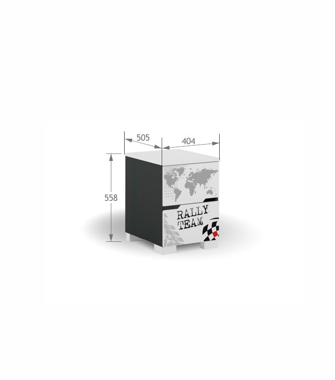 Grawerowane i malowane fronty z wyścigowymi motywami. Korpus i blat z antracytowej laminowanej płyty.