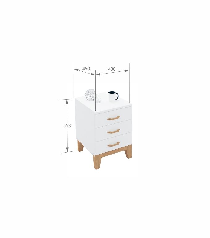 Kontenerek pod biurko w stylu skandynawskim lub szafka nocna. Szuflady zwieńczone drewnianymi uchwytami. Nóżki z litego drewna dębowego.