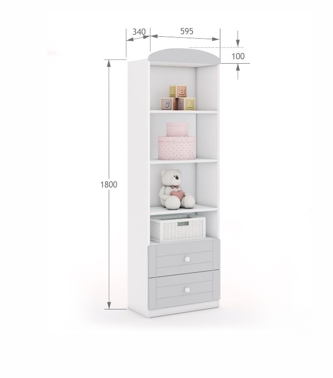 Regał z dwoma szufladami. Biały korpus i jasnoszare fronty malowane farbami rekomendowanymi przez Polskie Towarzystwo Alergologiczne (PTA) i utwardzane światłem UV. Grawerowane na frontach linie są motywem przewodnim kolekcji.