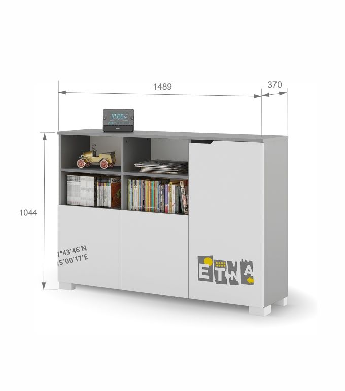 Grawerowane, malowane fronty z podróżniczym motywem. Korpus z szarej, laminowanej płyty.