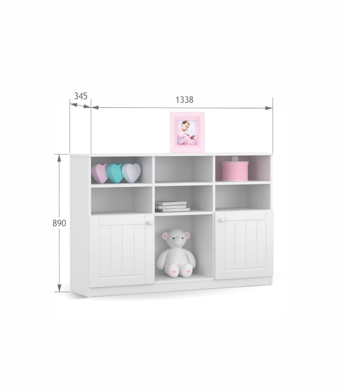 Grawerowane i malowane farbami wodnymi fronty. Delikatne uchwyty w kształcie kulek. Korpus z białej laminowanej płyty.