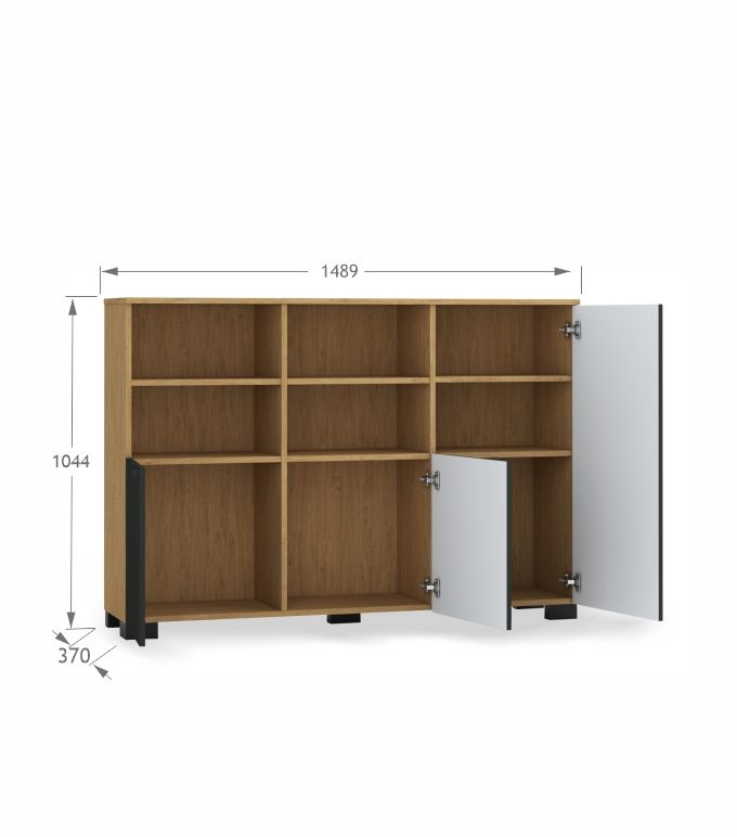 Ciemne fronty z motywem betonu. Korpus z laminowanej płyty w kolorze drewna. Idealny do pokoju ze skosami.