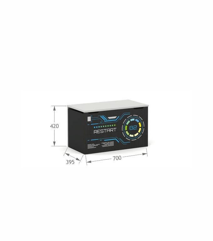 Ciemny front podkreślony kropkami i kolorowymi elementami prosto z gier komputerowych. Korpus z antracytowej i szarej, laminowanej płyty.