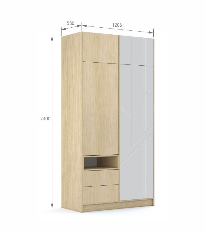 Dwudrzwiowa szafa z szufladami i ozdobną skrzynko-półką w lewej części. Pojemna szafa, w której dostosujesz wyposażenie wnętrza osobno dla każdej z trzech części. Dzięki takiej możliwości zyskujesz pewność, że szafa będzie dostosowana do Twoich oczekiwań i potrzeb, a odpowiednio dobrane wnętrze szafy, to większy komfort i wygoda użytkowania. Możliwość ustalenia w której części ma znajdować się drążek na wieszaki, a w której półki pozwala na używanie szafy równocześnie jako mebla do przechowywania ubrań i miejsca do schowania książek lub gier planszowych. To świetnie rozwiązanie szczególnie do niewielkich pomieszczeń, w których bardzo ważne jest optymalne wykorzystanie przestrzeni. Jest to również mebel odpowiedni dla każdego, kto ceni sobie zarówno design i funkcjonalność. Praktyczne połączenie głębokiej szafy z szufladami i skrzynko-półką zwiększa możliwości organizacji przestrzeni i aranżacji. Szafa zachwyca nie tylko praktycznością, ale również możliwością stworzenia wkoło niej przyjaznej przestrzeni, a to bardzo istotne zarówno w pokoju młodzieżowym jak i w sypialni. Duża szafa sprawdzi się w klasycznym, prostym wnętrzu oraz w nowoczesnej aranżacji.
