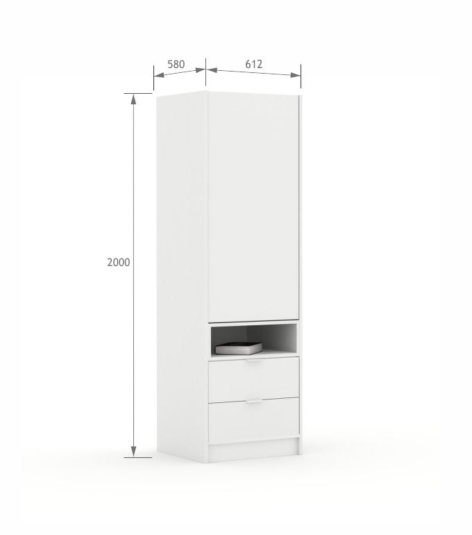 Jednodrzwiowa szafa z dwoma szufladami i skrzynko-półką. Fronty malowane farbami rekomendowanymi przez Polskie Towarzystwo Alergologiczne (PTA) i utwardzane światłem UV. Gładkie, białe fronty i biały korpus, to motyw przewodni kolekcji.