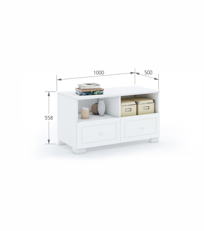 Młodzieżowa szafka pod telewizor lub biurko z dwiema półkami i szufladami. Korpus i blat z białej, laminowanej płyty. Uchwyty drewniane, malowane na biało. Możliwość wykorzystania jako element biurek typu Flex.