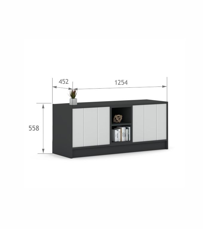 Nowoczesna szafka RTV z dwoma otwieranymi frontami i dwoma otwartymi półkami. Szafka wykonana jest z laminowanego, antracytowego korpusu i grawerowanych, jasnoszarych frontów. Fronty lakierowane są farbami rekomendowanymi przez Polskie Towarzystwo Alergologiczne (PTA) i utwardzane światłem UV.