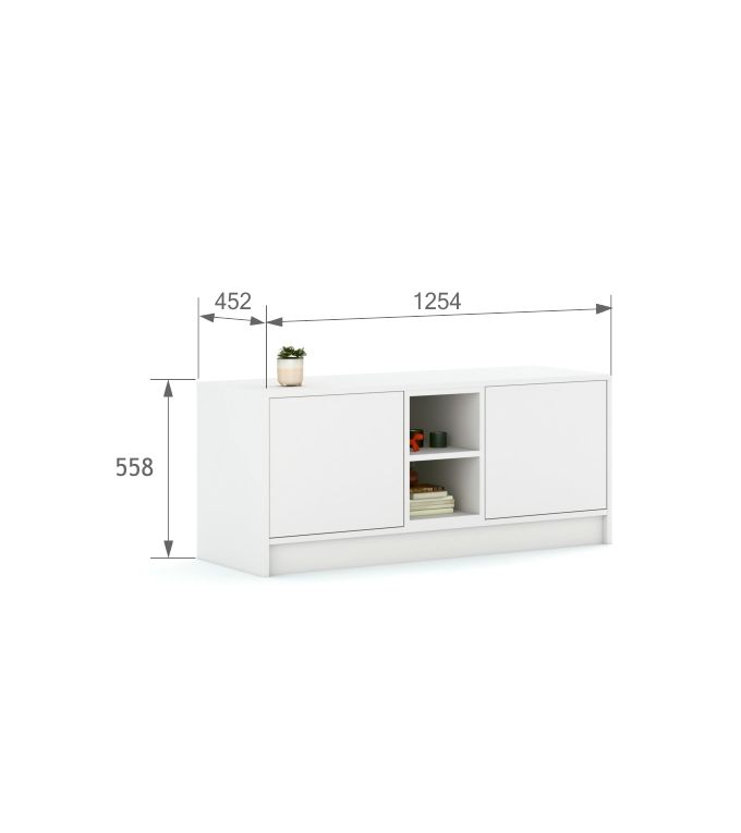 Nowoczesna szafka RTV z dwoma otwieranymi frontami i dwoma otwartymi półkami. RTV zbudowana jest z laminowanego, białego korpusu i białych, gładkich, lakierowanych frontów. Fronty są malowane farbami rekomendowanymi przez Polskie Towarzystwo Alergologiczne (PTA) i utwardzane światłem UV.