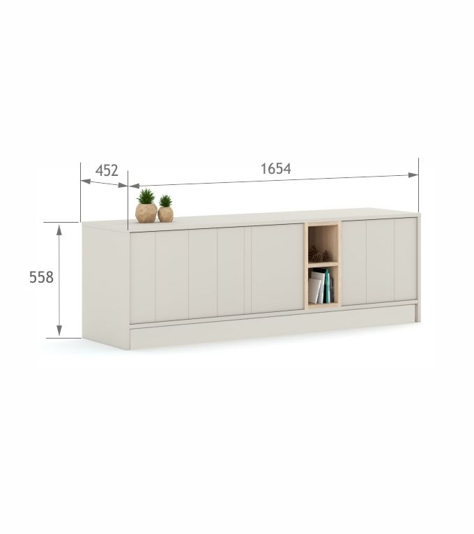 Nowoczesna szafka RTV z trzema otwieranymi frontami i dwoma otwartymi półkami. RTV zbudowana jest z Laminowanego beżowego korpusu i beżowych gładkich lakierowanych frontów. Fronty są malowane farbami rekomendowanymi przez Polskie Towarzystwo Alergologiczne (PTA) i utwardzane światłem UV.