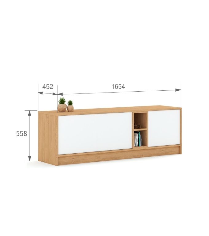 Nowoczesna szafka RTV z trzema otwieranymi frontami i dwoma otwartymi półkami. RTV zbudowana jest z laminowanego, dębowego korpusu i białych, gładkich, lakierowanych frontów. Fronty są malowane farbami rekomendowanymi przez Polskie Towarzystwo Alergologiczne (PTA) i utwardzane światłem UV.