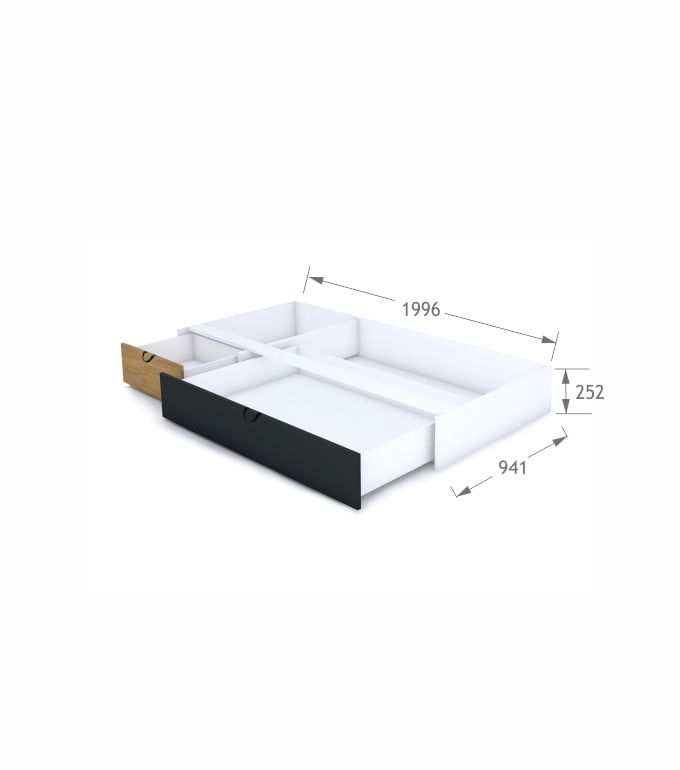 Dwuczęściowa szuflada łóżka z dębowym i antracytowym laminowanym czołem. Dopasowana do łóżek o długości 200 cm.