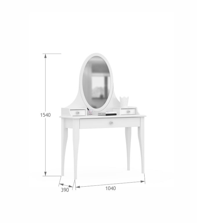 Duże, owalne lustro. Szkatułki i szuflada pod blatem ze stylowymi, kryształowymi uchwytami.